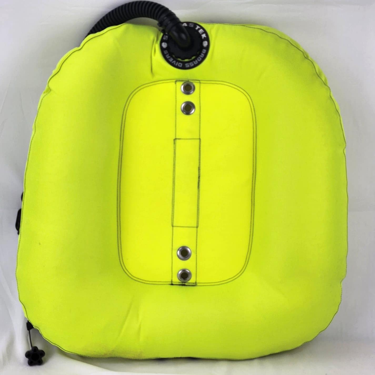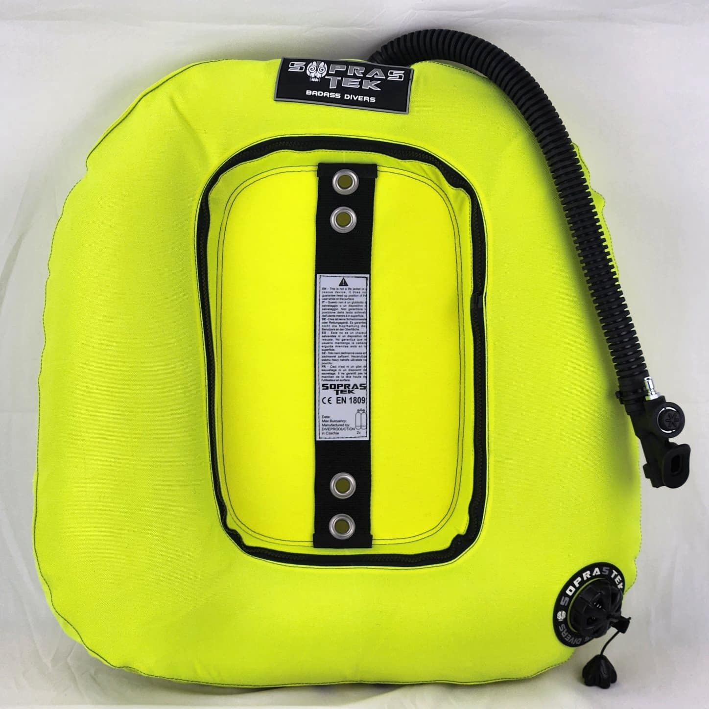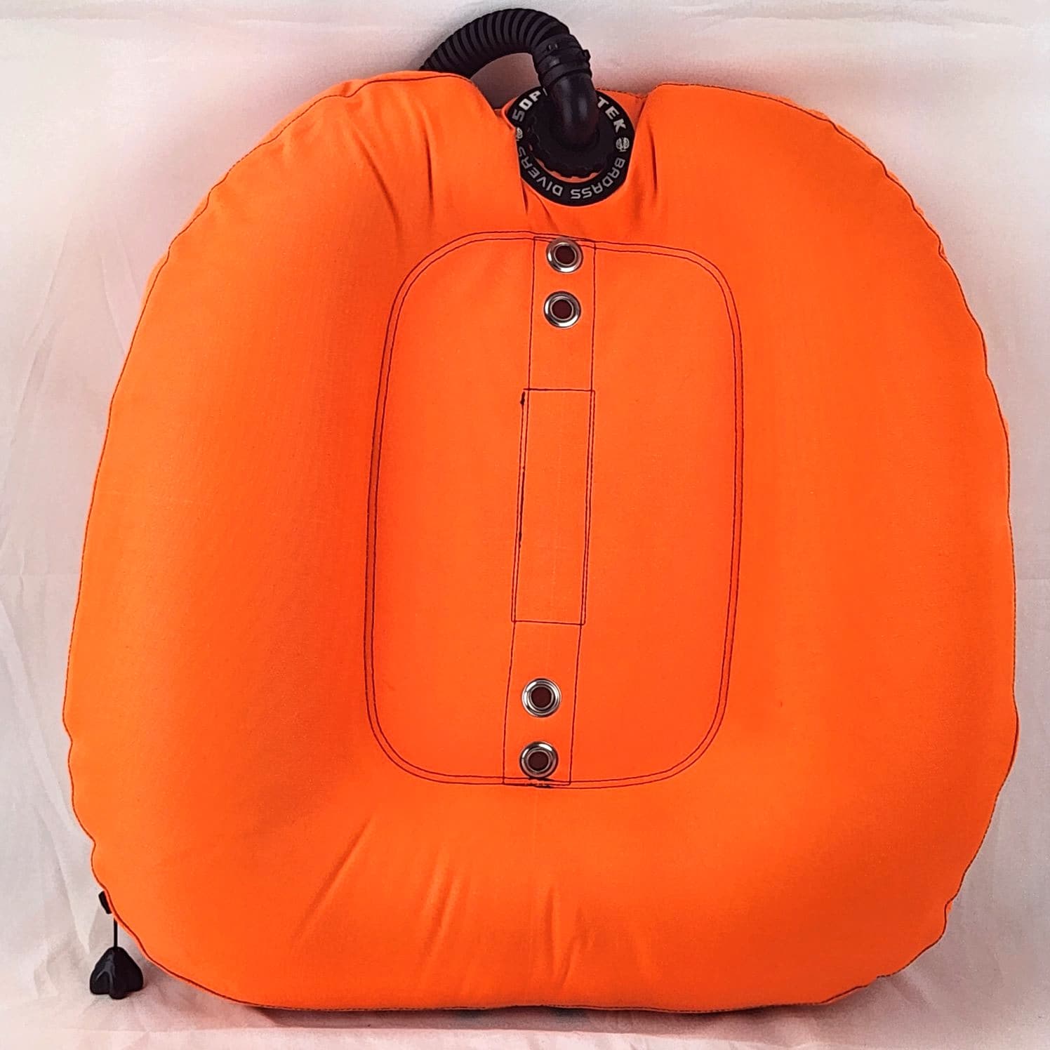 The inflator is attached to the centre of the bladder and fits perfect between your twin tanks. The high volume in the lower part of the bladder allows good buoyancy on the surface and perfect trim with Twin tanks.