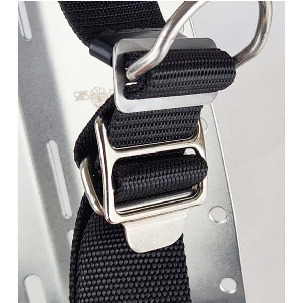 Harness with buckles for quick adjustment of the shoulder straps length.