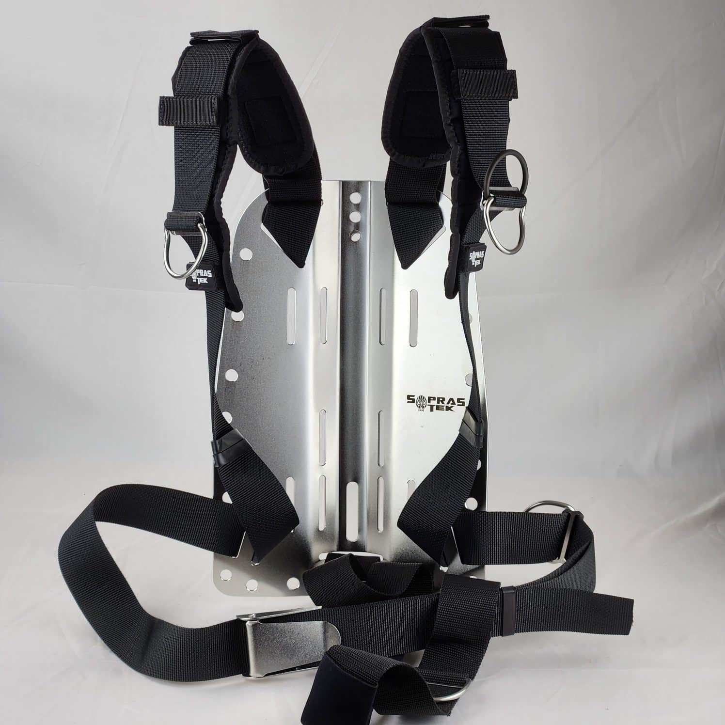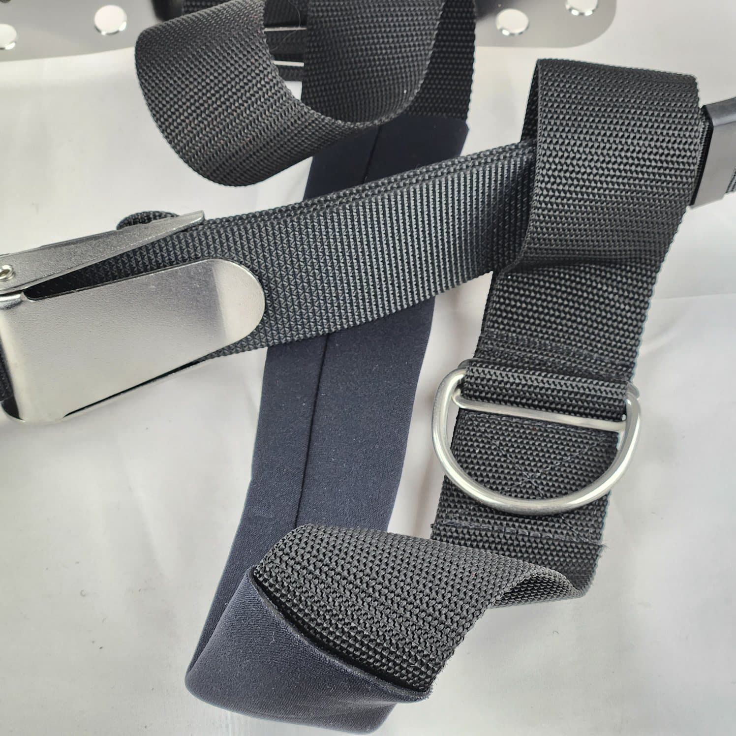Harness DIR style with D rings on shoulders and crotch strap and with neoprene padding on the shoulders and around the crotch strap.