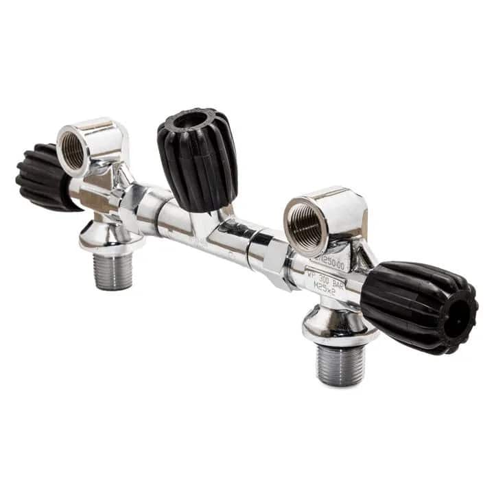 Twin tank valve with separation valve for tanks with diam 171 and 203mm at 300bar.