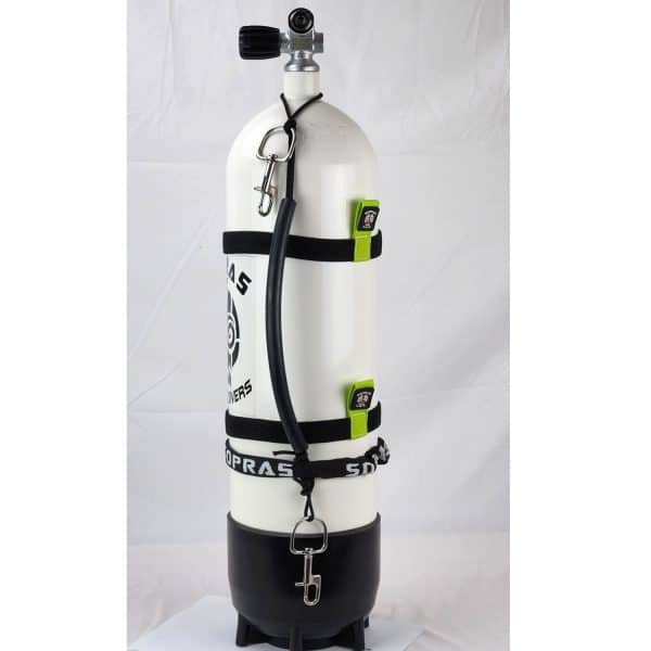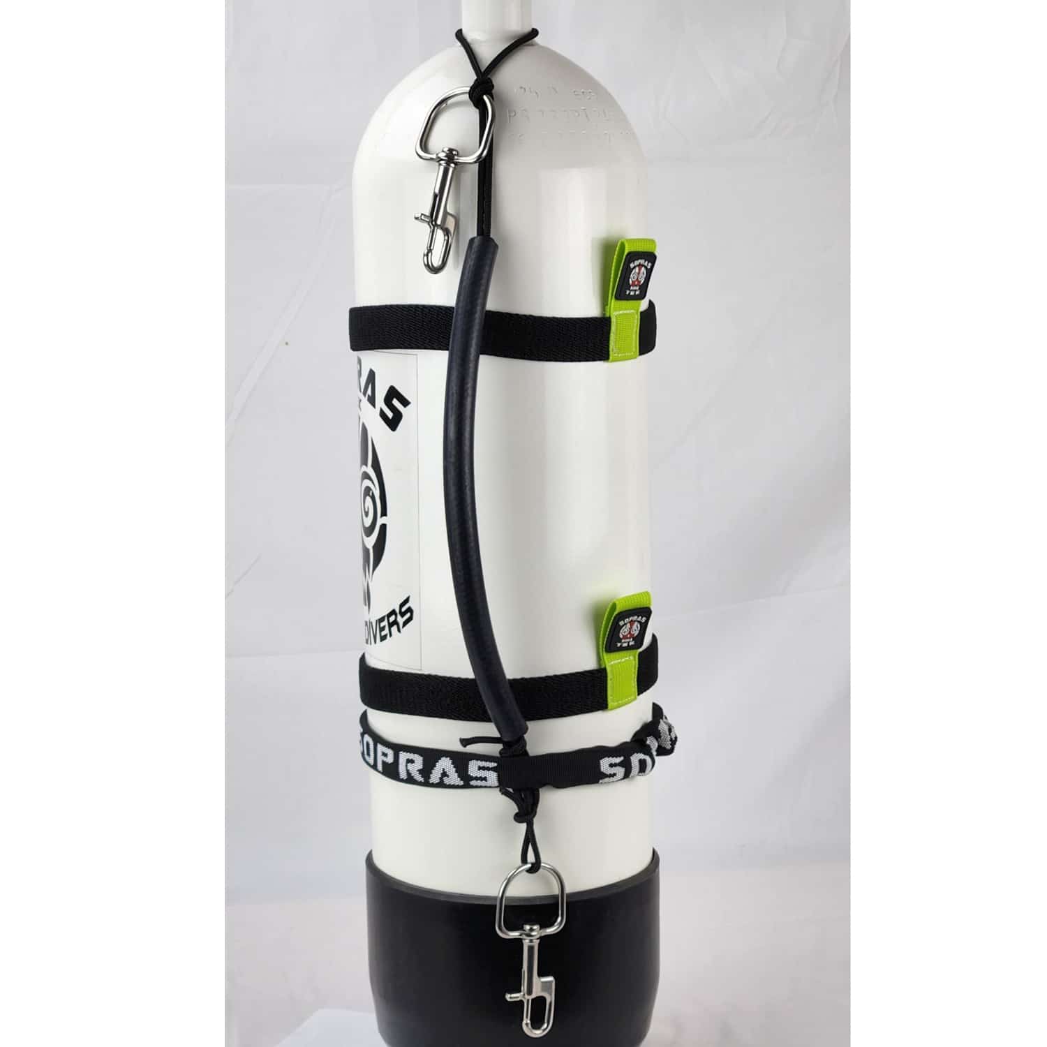 This simple but elegant solution provides a reliable and streamlined solution for stage/deco bottles. The heavy duty stainless steel zip tie band (61cm long) is enclosed in a delicated nylon sleeve to protect the cylinder´s exterior finishing. For use with cylinder with 170mm diameter (i.e. 10 liters or 12 liters long in steel).