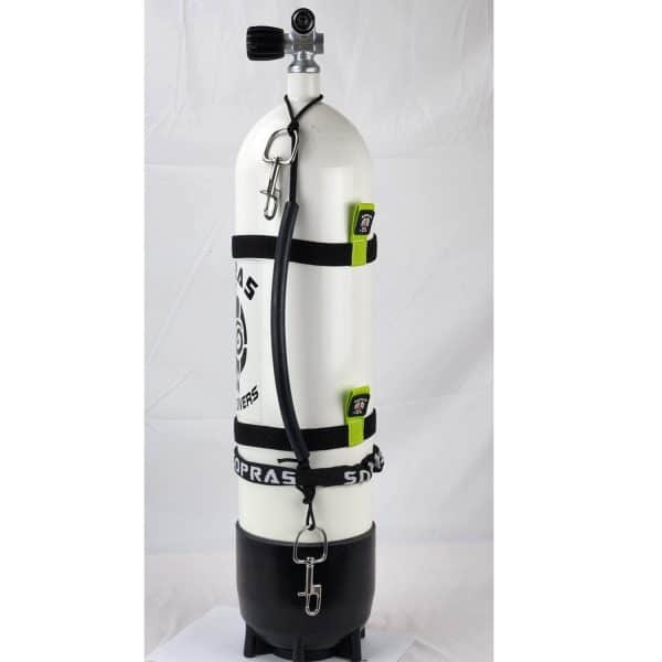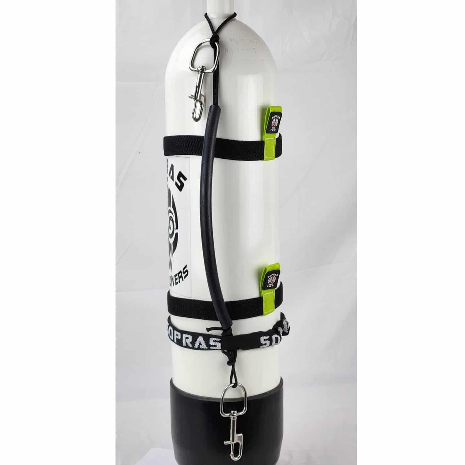 This simple but elegant solution provides a reliable and streamlined solution for stage/deco bottles. The heavy duty stainless steel zip tie band (50cm long) is enclosed in a delicated nylon sleeve to protect the cylinder´s exterior finishing. Ideal for use with alu cylinders S40(with diameter 133mm) but can also with 7liters steel with diameter 140mm.