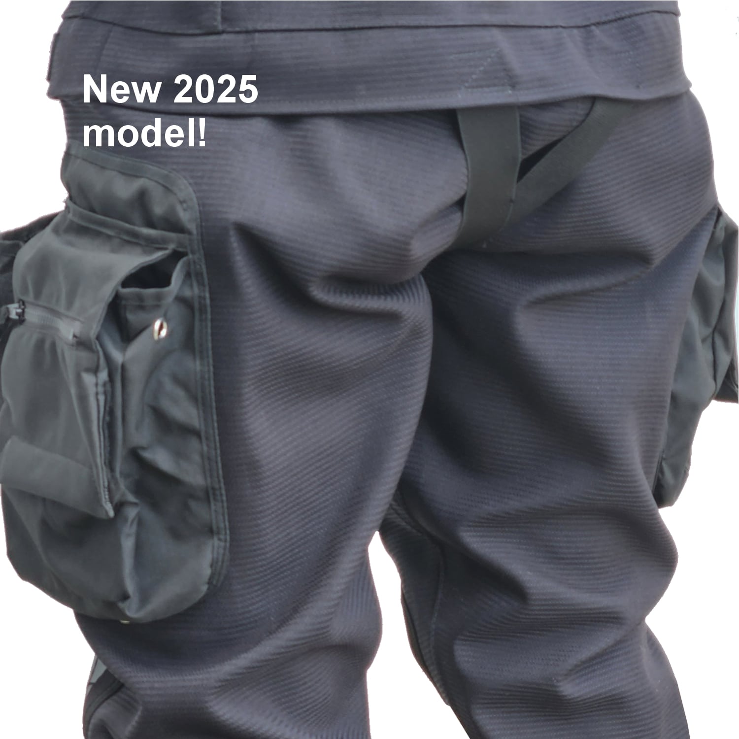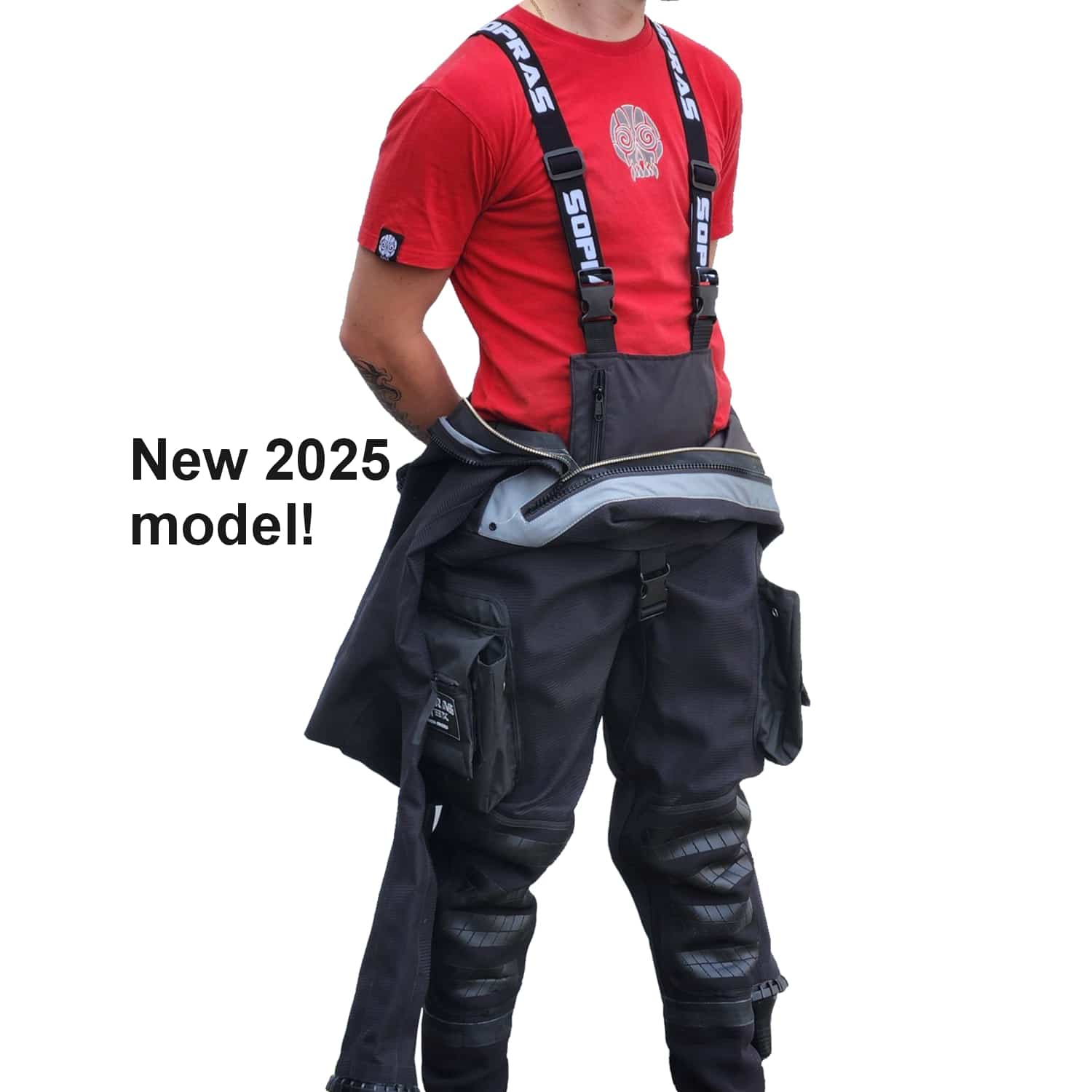 Black trilaminate suit with orust rings at neck and SLAGGO at wrist with silicone seals and boots.